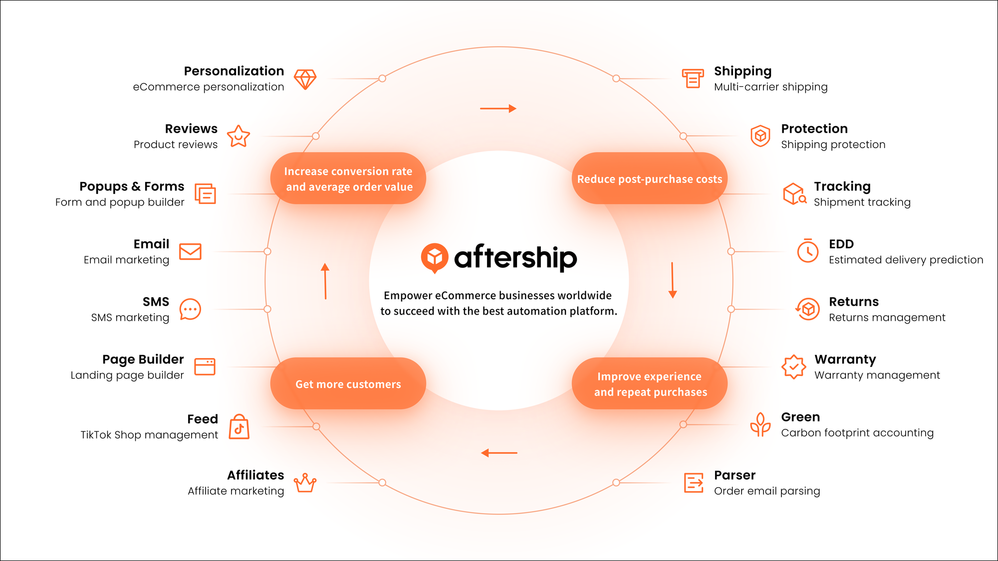 AfterShip has developed a comprehensive SaaS product suite based on the consumer lifecycle. It includes 8 post-purchase products and 8 marketing products, covering the entire shopping journey of eCommerce brands, including logistics tracking, returns, email marketing, product recommendations, and more.
