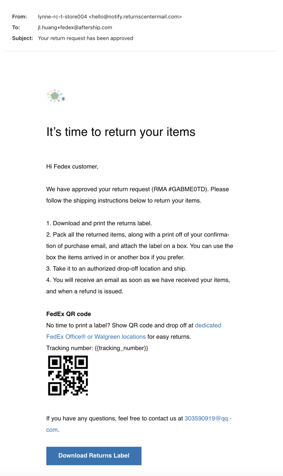 - The customer receives a return confirmation email with instructions on how to ship the item back