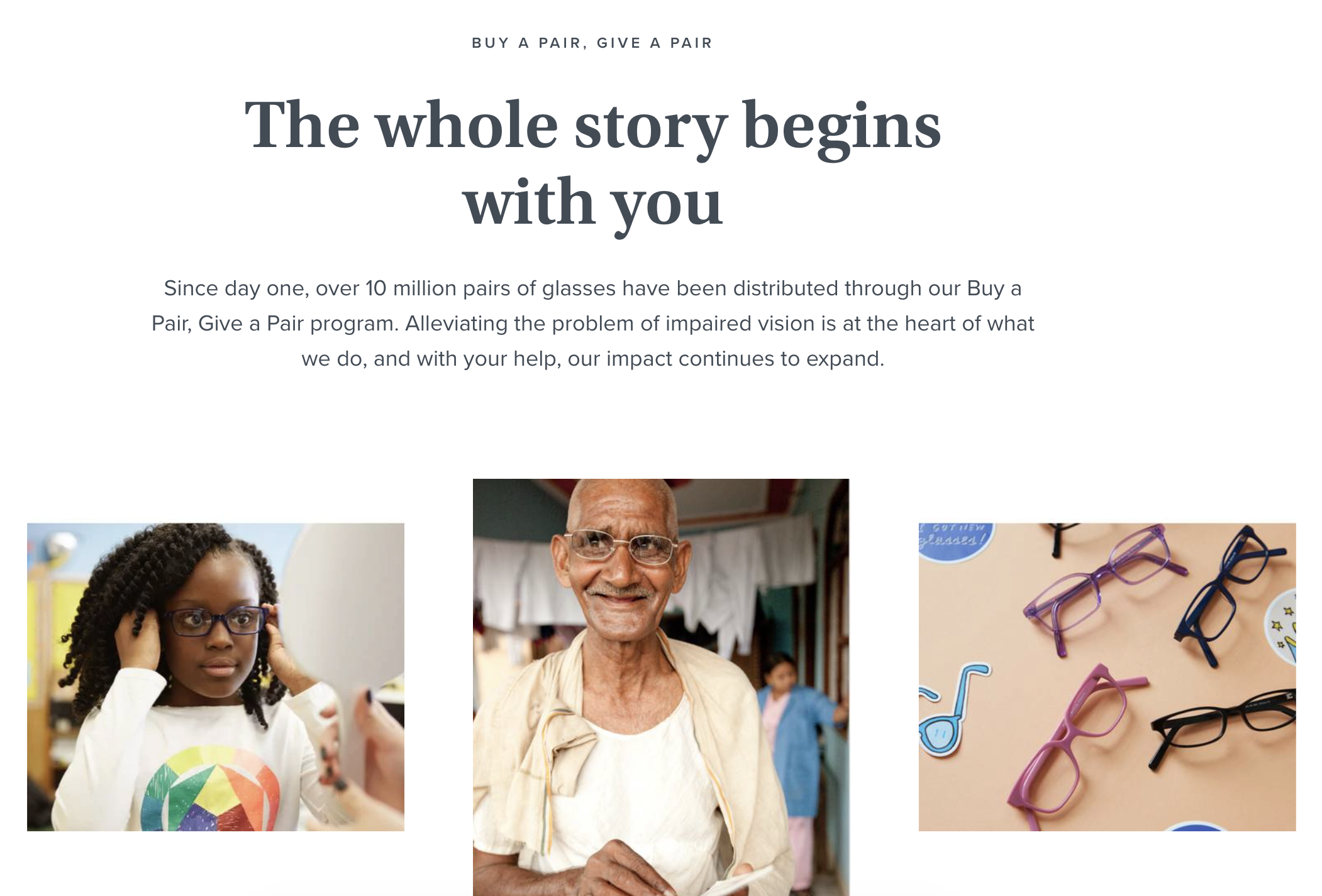 But intelligent decisions like these aren't the only reason for Warby Parker's colossal success. The company practices a value-driven, customer-centric marketing strategy. For instance, WP is known for its excellent cause marketing, aligning its values with customers by implementing socially responsible initiatives. Their "Buy a Pair, Give a Pair" program exemplifies this approach. For every pair of glasses sold, a pair is donated to someone in need, fostering a strong connection with their customer base through shared values and social impact.