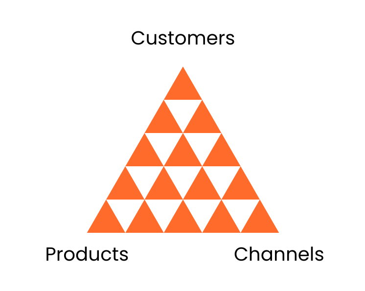 The deceptively simple triangle below contains the most significant elements you must consider to launch or grow a marketing campaign in the eComm space: customers, products, and channels. Of course, within it are dozens of considerations and decisions unique to your business. Taken as a whole, it also represents the point of convergence for your marketing strategy, where your customers' needs, the value of your products, and the strengths of your chosen channels intersect.