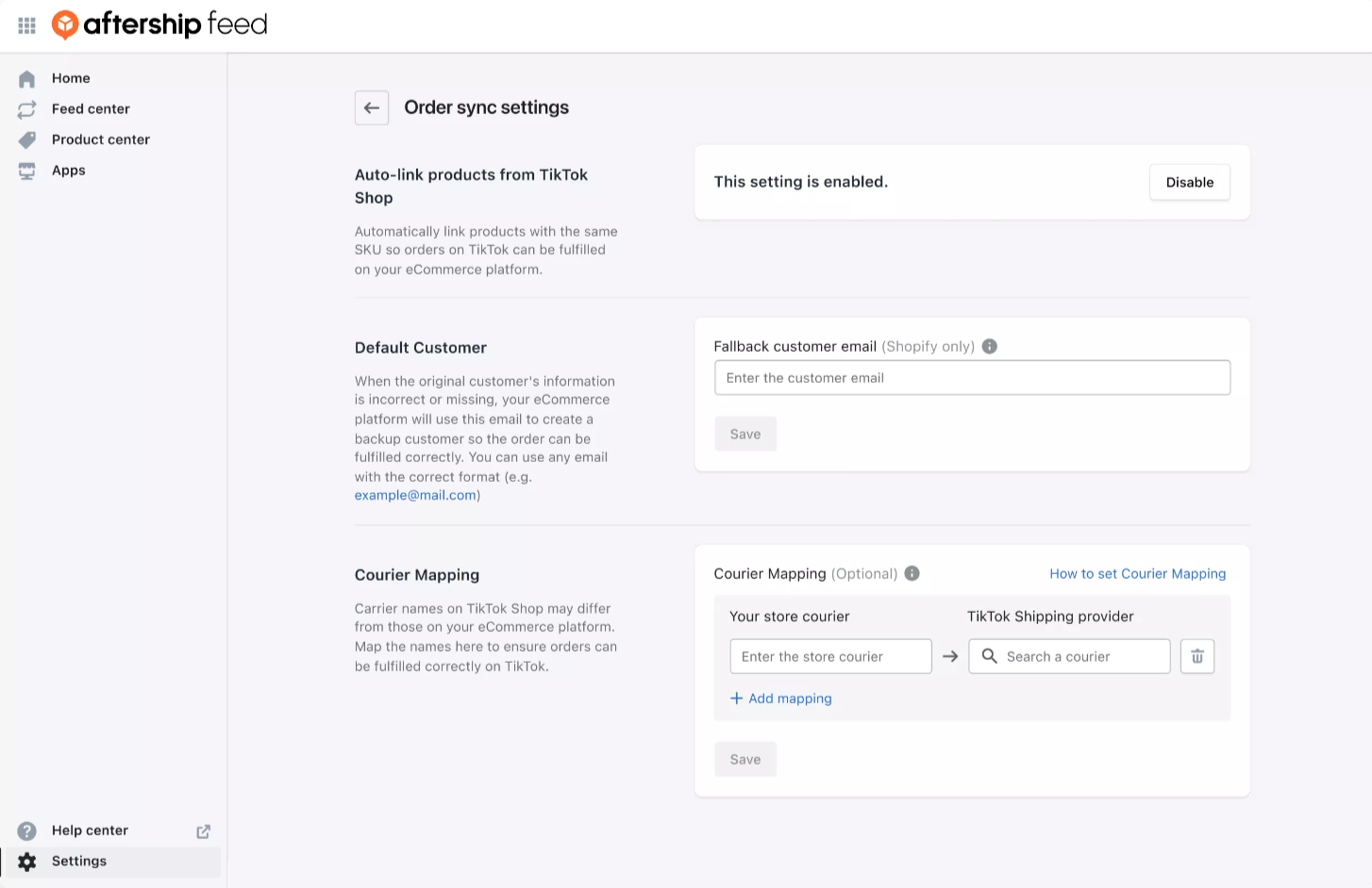 No need to manually link products or centralize orders. Connect your TikTok Shop with major platforms like Shopify, Shopify Plus, BigCommerce, Magento, WooCommerce, or Salesforce Commerce Cloud, and manage all your operations through AfterShip Feed.