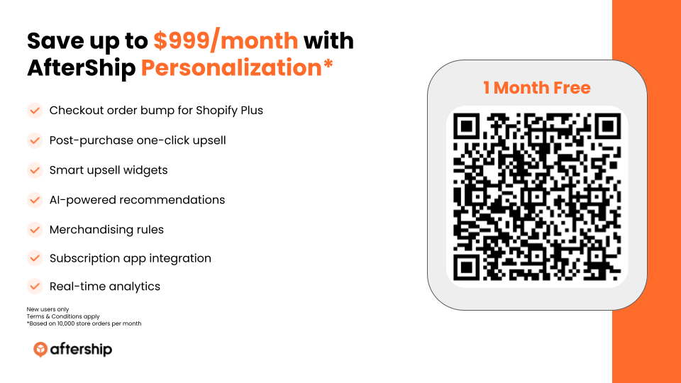 Boosting AOV is imperative to eCommerce success. AfterShip Personalization helps you achieve just that. For a limited time, new users can get 1 month free. Try AfterShip Personalization today.
