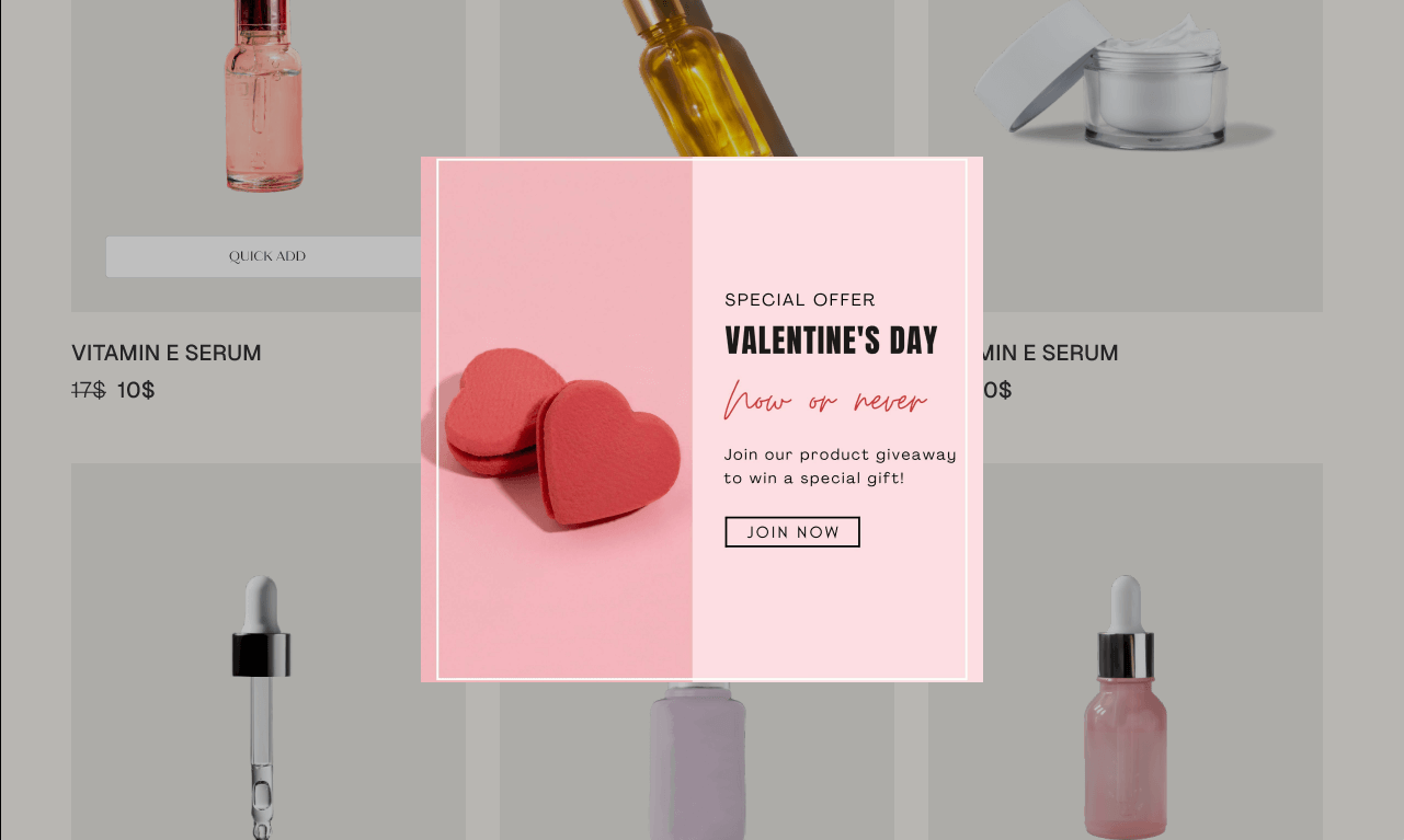Steal this example: Offer a discount or free gift with purchases made before Valentine's Day to encourage early shopping and boost sales. You could even use targeted popups to showcase specific products or highlight a limited-time offer or sale.